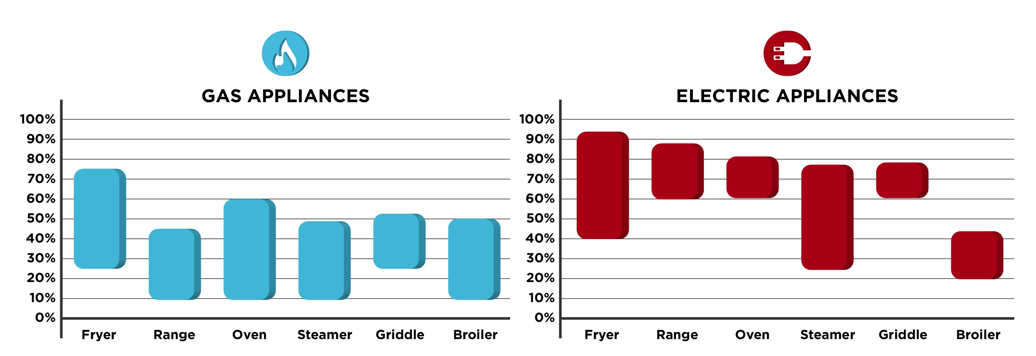 Eliminating or reducing combustion from the kitchen by using electric appliances is one of the most impactful changes that can be made to the traditional commercial kitchen. Electric appliances are generally much more efficient than their gas counterparts, and they don’t release harmful combustion byproducts into the working environment. Because electric equipment doesn’t require venting of combustion gases through a flue, much more of the energy is available for cooking food. A study produced by the Food Service Technology Center in San Ramon, CA compared the range of efficiencies between gas and electric cooking appliances. The results of their study are shown in the figure below, highlighting electric equipment as more efficient in each case.